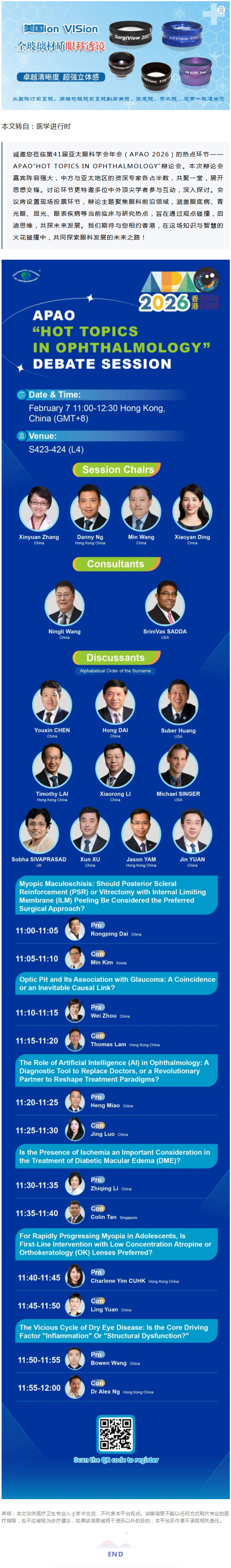 2月7日·香港见丨APAO“HOT TOPICS IN OPHTHALMOLOGY”辩论会:亲临现场投票,感受思辩激荡--2026-02-06 发布时间:2026-02-06 来源: 作者: