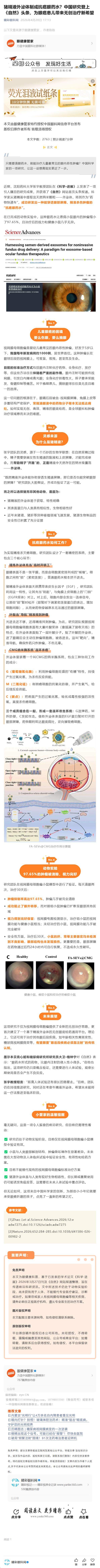 新闻中心 您的当前位置:首页 > 新闻中心 > 猪精液外泌体制成抗癌 猪精液外泌体制成抗癌眼药水?中国研究登上《自然》头条,为眼癌患儿带来无创治疗新希望----2026-4-28 发布时间:2026-04-28 来源: 作者: