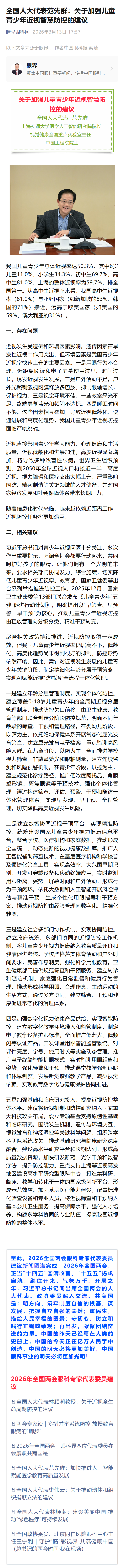 新闻中心 您的当前位置:首页 > 新闻中心 > 全国人大代表范先群: 全国人大代表范先群:关于加强儿童青少年近视智慧防控的建议------2026-3-13 发布时间:2026-03-13 来源: 作者: