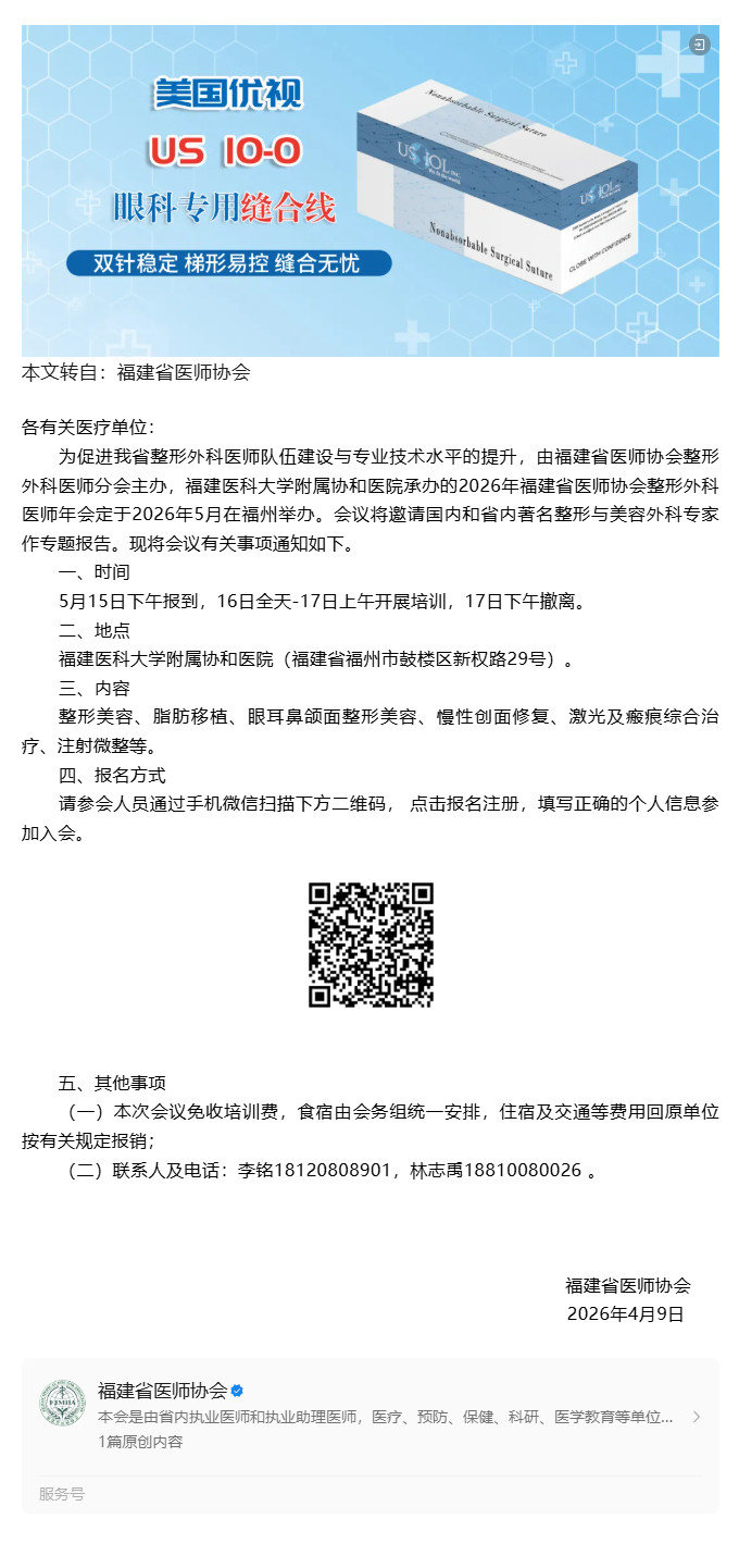 5.15-17福州 | 福建省医师协会关于举办2026年整形外科医师年会的通知---2026-04-17 发布时间:2026-04-17 来源: 作者: