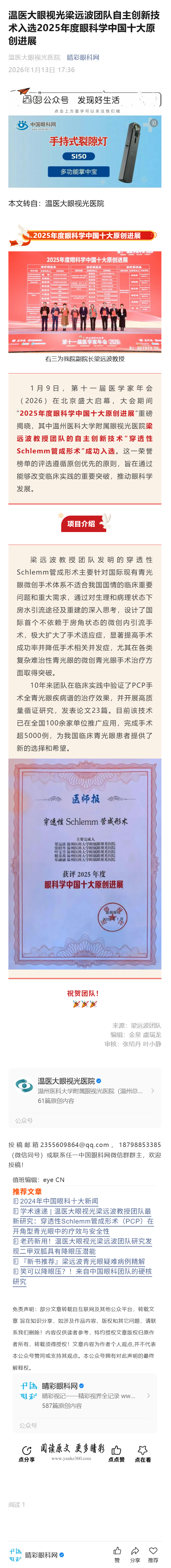 新闻中心 您的当前位置:首页 > 新闻中心 > 温医大眼视光梁远波团 温医大眼视光梁远波团队自主创新技术入选2025年度眼科学中国十大原创进展-----2026-1-13 发布时间:2026-01-13 来源: 作者: