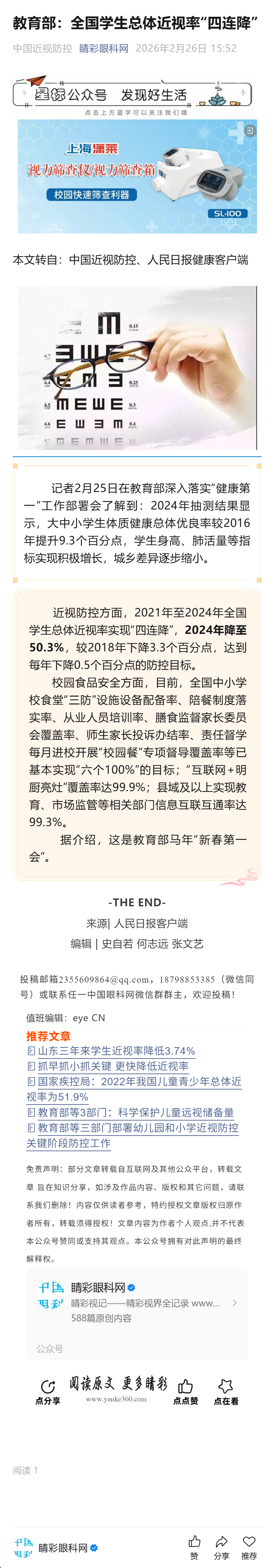 教育部:全国学生总体近视率“四连降”-------2026-2-26