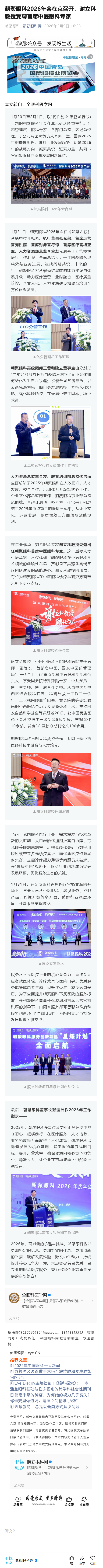 新闻中心 您的当前位置:首页 > 新闻中心 > 朝聚眼科2026年会在京 朝聚眼科2026年会在京召开,谢立科教授受聘首席中医眼科专家-----2026-2-9 发布时间:2026-02-09 来源: 作者: