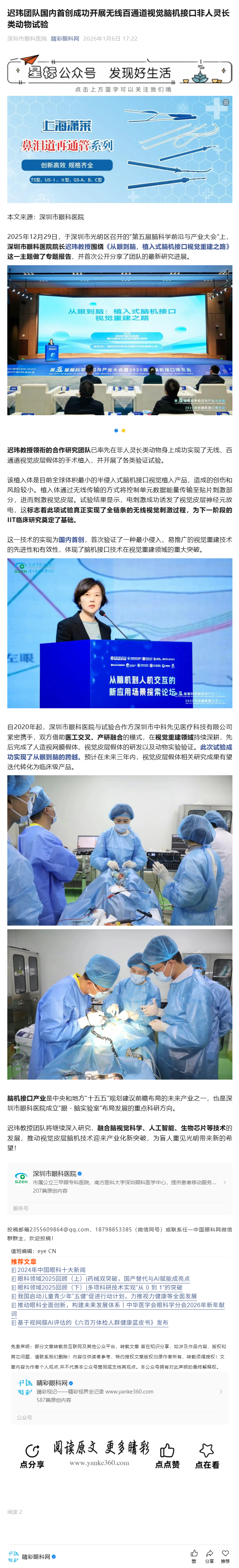 新闻中心 您的当前位置:首页 > 新闻中心 > 迟玮团队国内首创成功 迟玮团队国内首创成功开展无线百通道视觉脑机接口非人灵长类动物试验-----2026-1-6 发布时间:2026-01-06 来源: 作者: