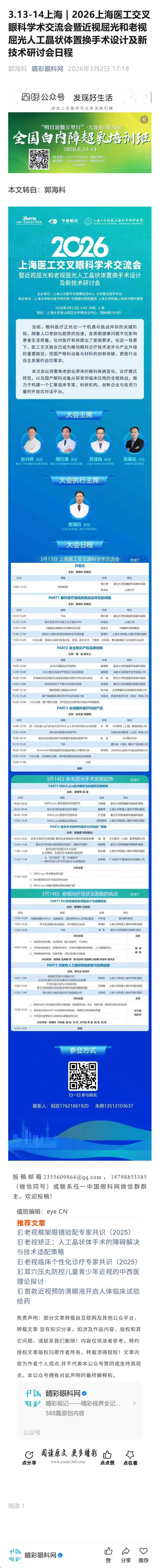 新闻中心 您的当前位置:首页 > 新闻中心 > 3.13-14上海 | 2026上 3.13-14上海 | 2026上海医工交叉眼科学术交流会暨近视屈光和老视屈光人工晶状体置换手术设计及新技术研讨会日程----2026-3-2 发布时间:2026-03-02 来源: 作者: