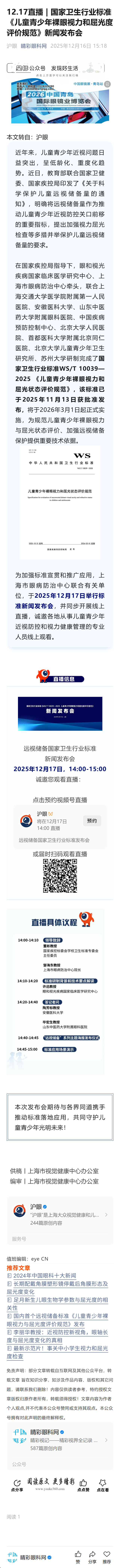 新闻中心 您的当前位置:首页 > 新闻中心 > 12.17直播 | 国家卫生 12.17直播 | 国家卫生行业标准《儿童青少年裸眼视力和屈光度评价规范》新闻发布会-------2025-12-16 发布时间:2025-12-16 来源: 作者: 原文链接