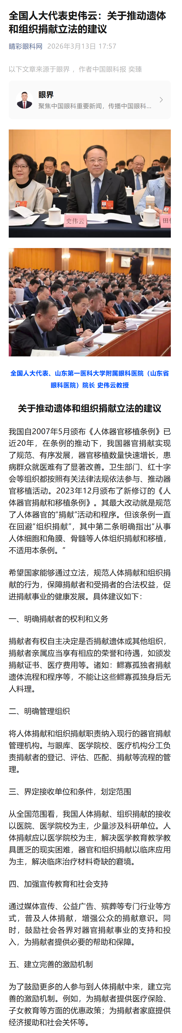 全国人大代表史伟云:关于推动遗体和组织捐献立法的建议-----2026-3-13