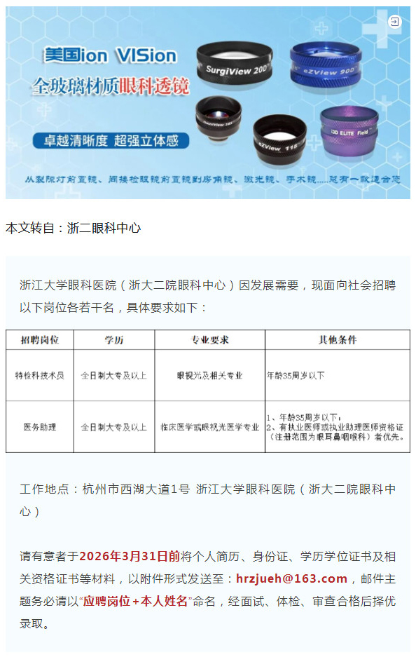 招聘 | 浙江大学眼科医院(浙大二院眼科中心)招聘特检科技术员、医务助理--2026-03-24 发布时间:2026-03-24 来源: 作者: