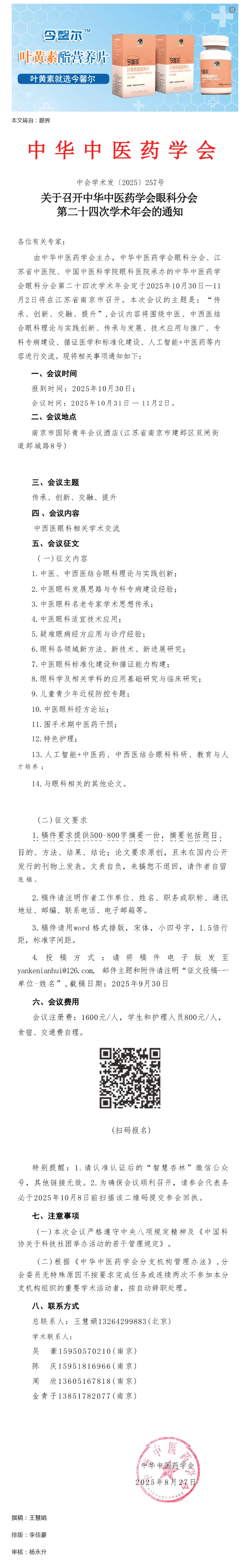 10.30-11.2南京 | 中华中医药学会眼科分会第二十四次学术年会---2025-10-20 发布时间:2025-10-20 来源: 作者: