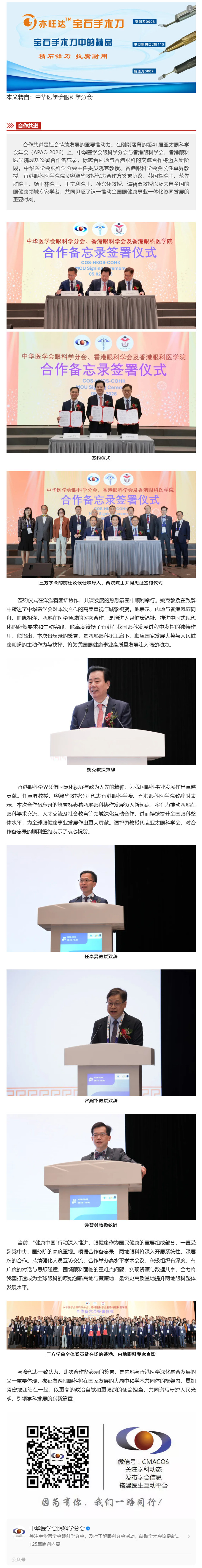中华医学会眼科学分会与香港眼科学会、香港眼科医学院在港签署合作备忘录---2026-02-11 发布时间:2026-02-11 来源: 作者: